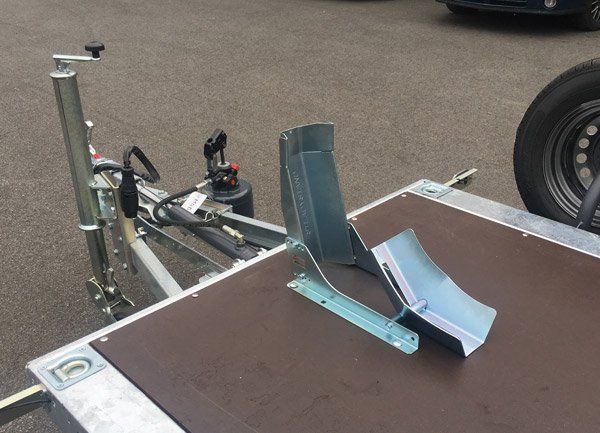 Cette remorque est équipée d’un dispositif de rotation de l’essieu à l’aide d’un équipement hydraulique combiné avec la flèche d’attelage. La descente hydraulique s’effectue par gravité, et le relevage est réalisé par l’actionnement d’une pompe hydraulique manuelle (environ 20 secondes) combinée avec un vérin situé à proximité de la tête d’attelage. La pente est de l’ordre de 3° à 5° en fonction de la hauteur du crochet d’attelage.